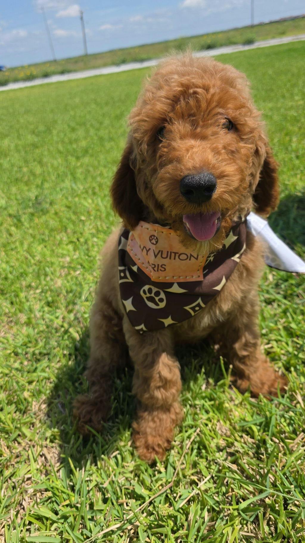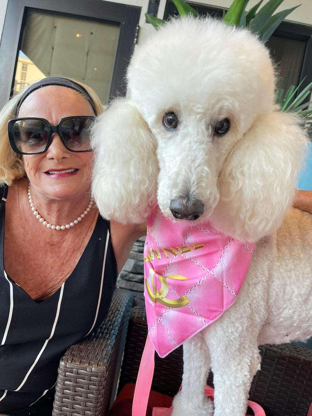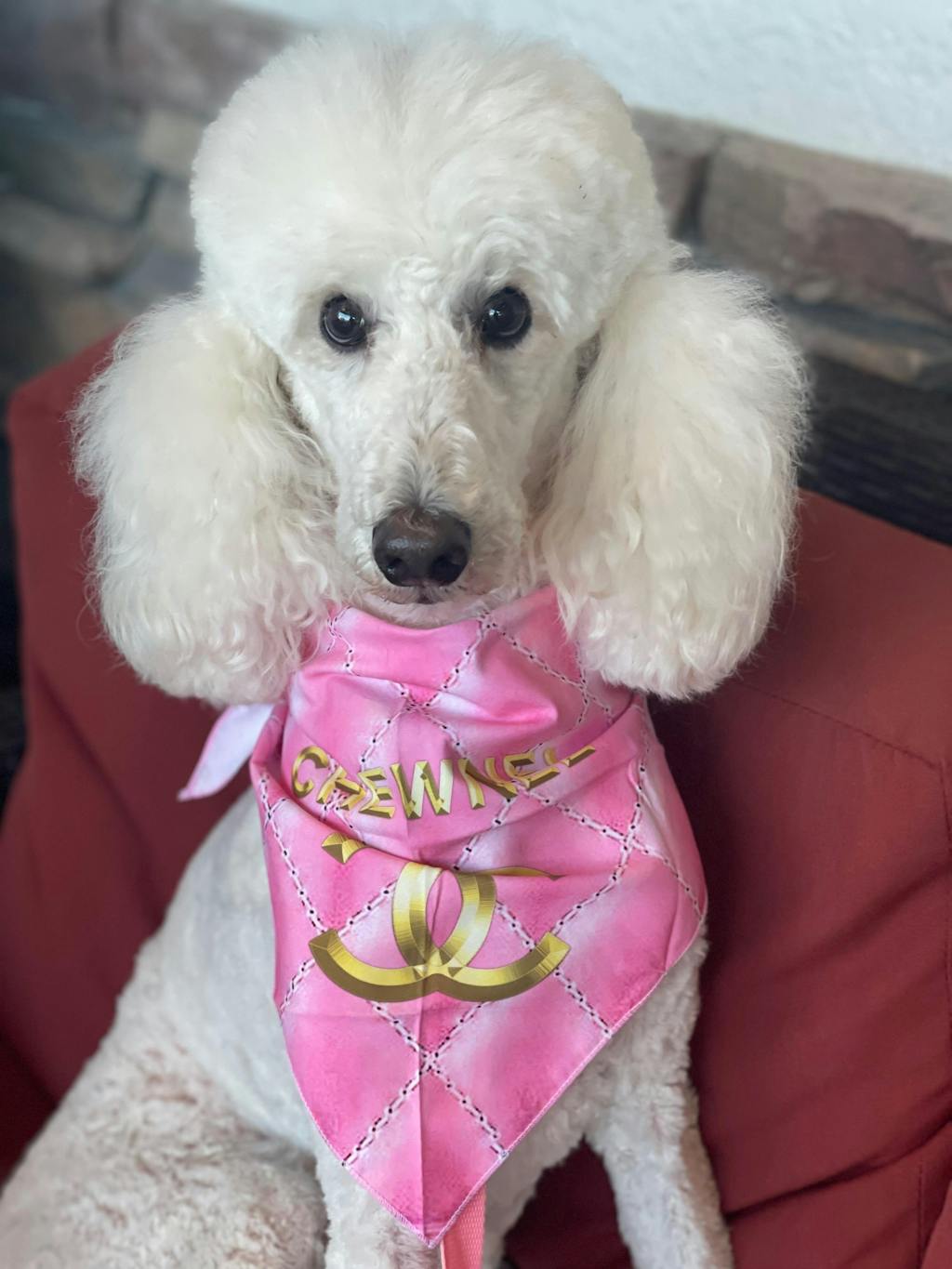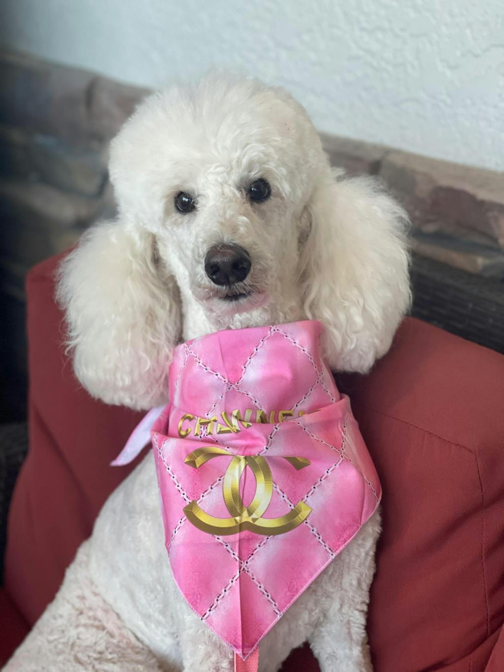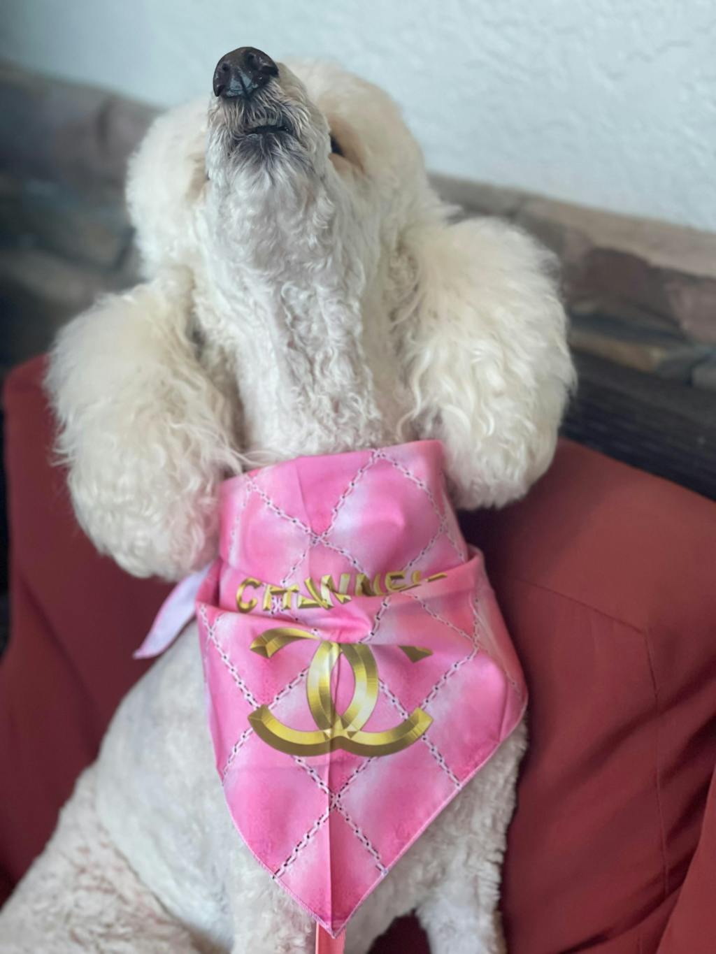 My white standard poodle Lacey love her Chanel scarf and love to wear whenever she is going to a restaurant with me!